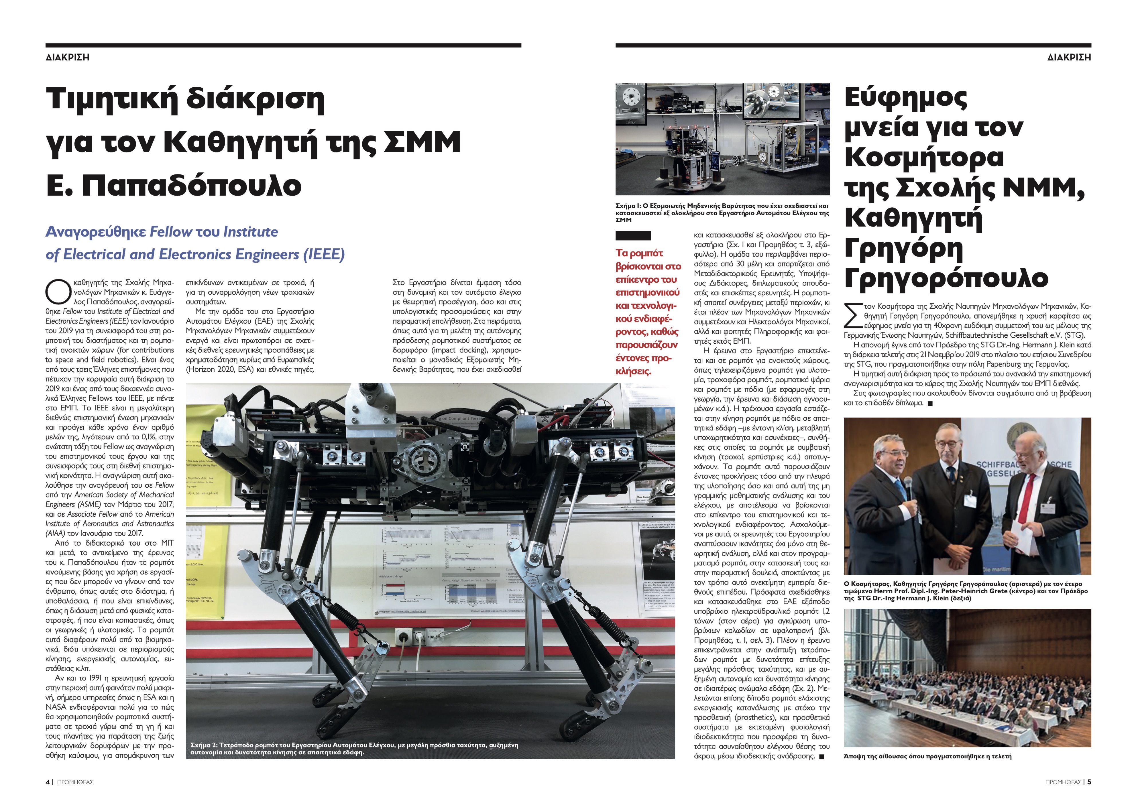 Τιμητική διάκριση για τον καθηγητή της ΣΜΜ Ε. Παπαδόπουλο,” Περιοδικό Προμηθέας, ΕΜΠ, τεύχος 13, Δεκέμβριος 2019 Ιανουάριος 2020, σελ. 4-5.